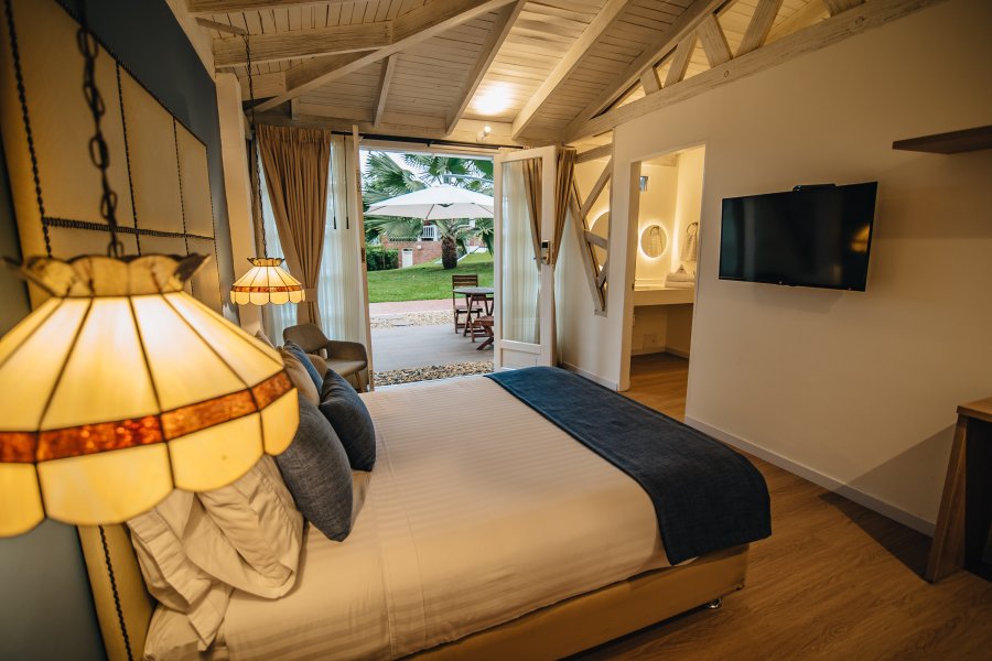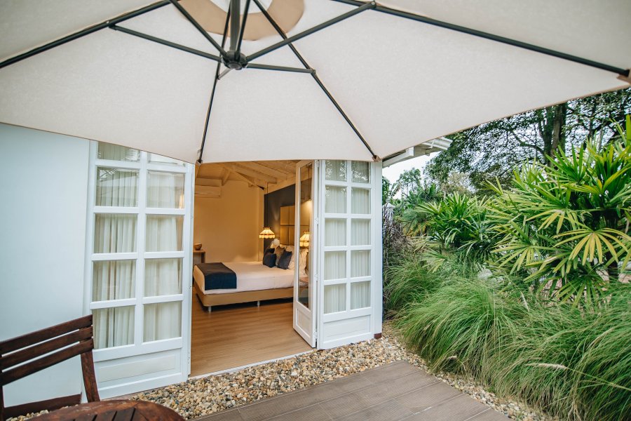 La habitación Ovalo cuenta con 29 m2 (20 m2 de habitación y 9 m2 de terraza privada con vista a la piscina) llenos de lujo y estilo. Los tonos verdes agua de su decoración hacen un perfecto contraste con el verde de los jardines y el azul de la piscina.