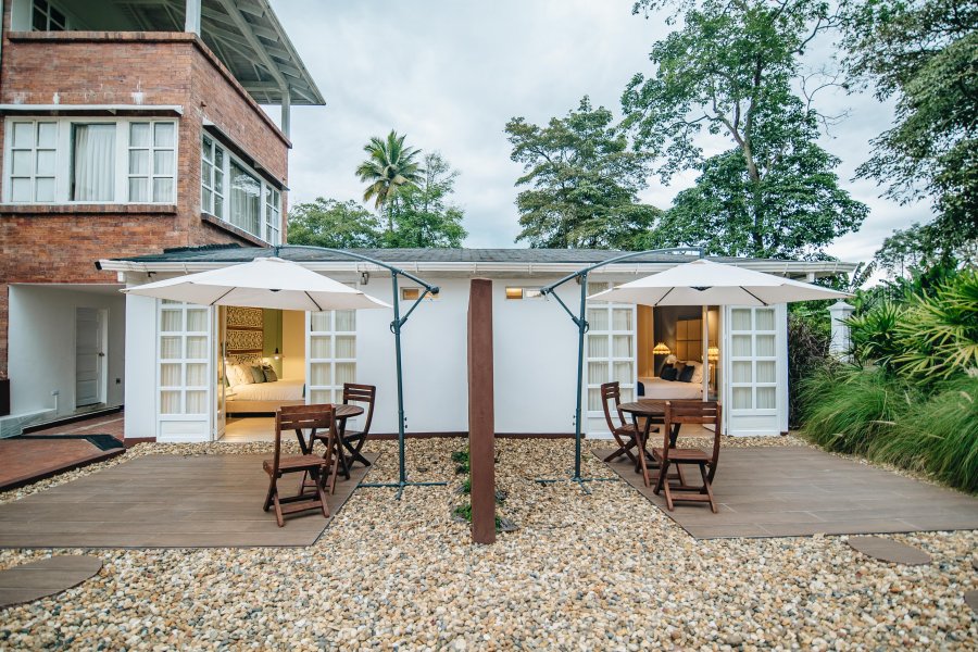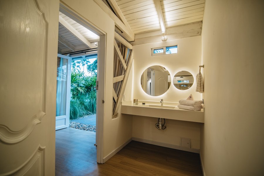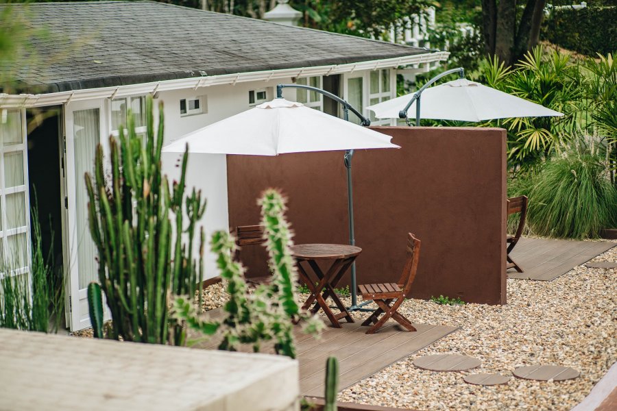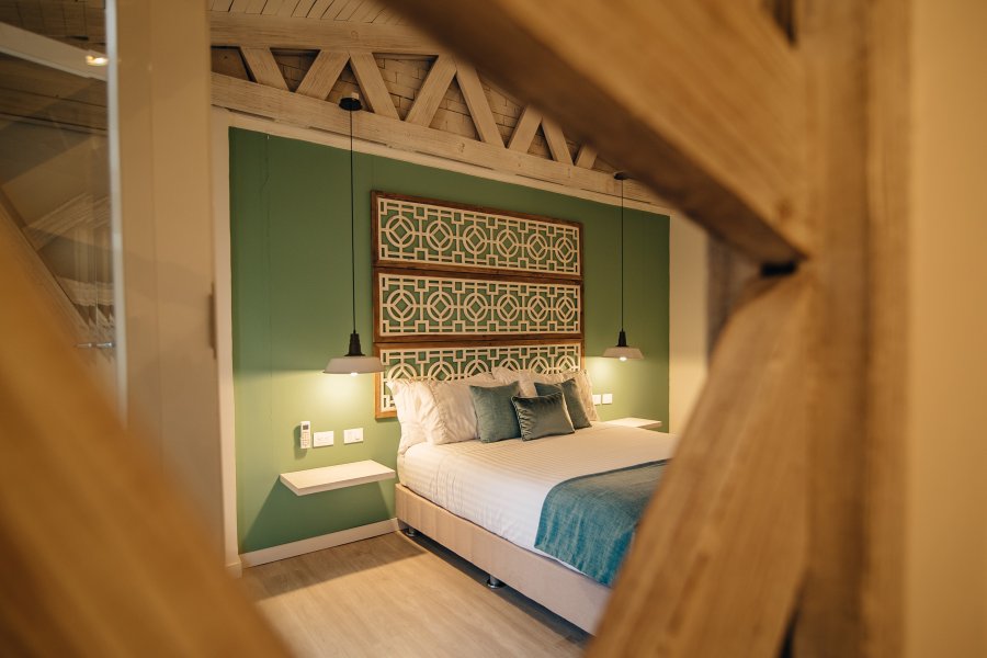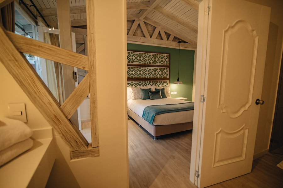La habitación Rombo cuenta con 31 m2 (22 m2 de habitación y 9 m2 de terraza privada con vista a la piscina y jardines) llenos de lujo y estilo. Los tonos azules de su decoración hacen un perfecto contraste con el azul de la piscina y el cielo.